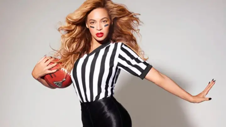 Beyoncé aparece vestida de juíza na foto promocional do Super Bowl. A cantora mostra todo seu charme, com uma camisa listrada preta e branca, com o rosto pintado, usando uma bota de cano longo e segurando uma bola de futebol.