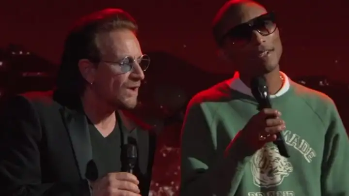 Bono e Pharrell, se apresentaram na noite de ontem (20) no talk show apresentado pelo comediante Jimmy Kimmel na televisão dos EUA. A performance fez parte de uma edição beneficente do programa dedicada a aumentar a conscientização das pessoas para a AIDS e angariar fundos para a RED, a ONG fundada pelo vocalista do U2.