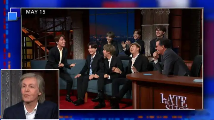 Durante a conversa, Colbert perguntou se ele ficava maravilhado em como a sua obra conseguiu alcançar as mais diversas culturas e gerações e quis saber se ele conhecia o BTS. "Eles são a maior coisa no mundo agora", diz o comediante enquanto McCartney diz que já tinha ouvido essa informação.