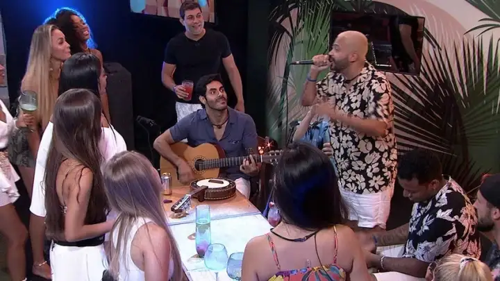 Projota foi um dos artistas que soltou a voz na roda de samba feita pelos participantes do Big Brother Brasil, na festa do líder, nesta quarta-feira (10).