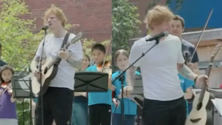 Em um vídeo publicado pelo próprio cantor em suas redes sociais, Sheeran aparece no palco, soltando a voz no microfone enquanto é acompanhado pelos instrumentos do grupo de crianças, com os pais assistindo orgulhosos à frente.