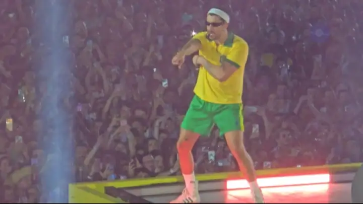 Bad Bunny no palco durante a sua apresentação em São Paulo (crédito foto: X / @brekkerclub)